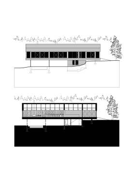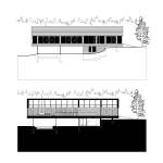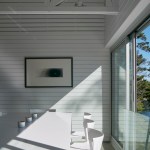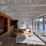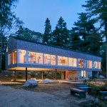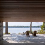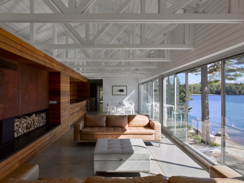 The southern façade is entirely operable with large sliding glass panels. When opened up, the façade allows for the elevated volume to act as a giant porch open to the environment and intimately connected to the lake shore. The thick totemic north wall protects and insulates the interior from the public, north side and continuous outsulation on walls and roof provides high R-value and minimizes thermal bridging. This passive solar dwelling has a high thermal mass concrete floor, and hydronic in floor heating.