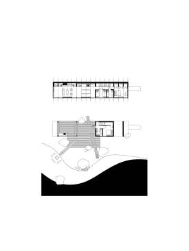 Mirror Point Cottage is a vacation home for a local fisherman’s daughter, her Dutch minimalist husband, and their two young children on a lake near Annapolis Royal in Nova Scotia. It is formally expressed as an elevated 80-foot long extruded ‘fish shed’ supported by a steel aedicule and a board formed concrete entry core.