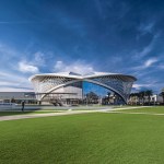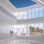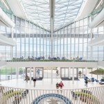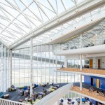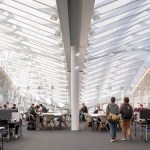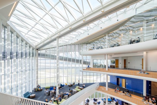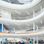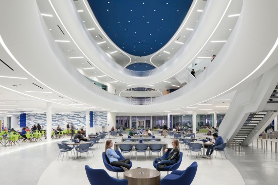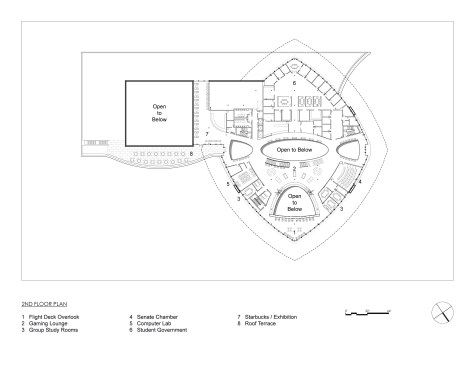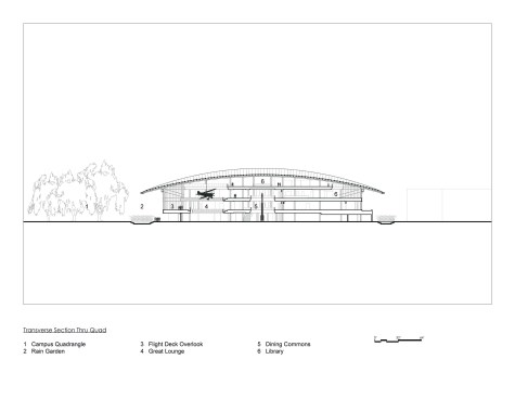 Internally, the 177,000 square foot student union building is an aeronautical athenaeum combining social learning spaces, events, dining and the university library. A soaring, triple height commons anchors and integrates the collaborative social and learning interiors. Wrapping this space and open to it are lounges, dining venues, group study rooms, clubs and organizations, career services and the university library as well as an event center, creating a virtual “city within a city”.