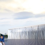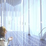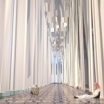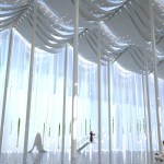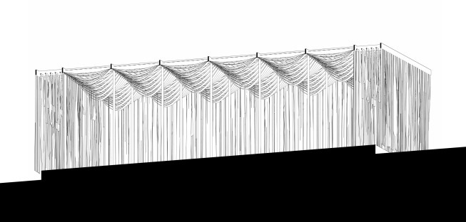 The light steel structure and the array of fabrics exchange their properties, creating semi-open / semi-closed spaces, while accentuating the interplay of light and shadow. The curtains that are used in lieu of walls subdivide the vast space and underline the human scale, as their light and tactile nature responds to the circulation of people between them.