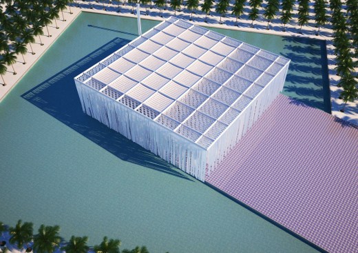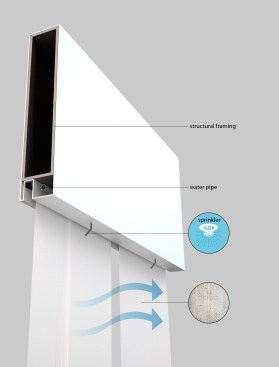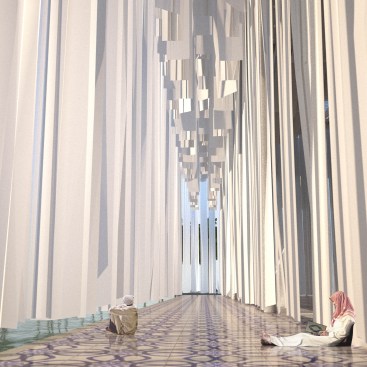 The cooling pond around the mosque utilizes grey water from the surrounding buildings. An embedded sprinkler system uses the grey water in order to moist the fabrics on the perimeter of the building envelope. The gaps between the curtains allow for the air to circulate and through the resulting evaporation they cool the space, enhancing the natural ventilation while taking advantage of the fabric’s breathability.