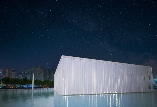At night, the translucent nature of the fabrics gives the building a strong presence by illuminating a soft glow to the surroundings. The arrangement establishes a rhythm that is highlighting the unique textile texture. It gives to the form its essence and exposes the character of the internal volume.