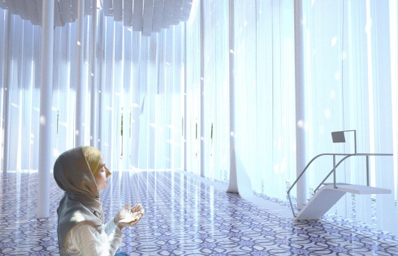 The layering of textiles defines the gradual transition from exterior to interior. The undulations of fabrics create a changing rhythmical pattern enhanced by the continuous play of light and shadow that changes throughout the day. Interior is flooded with filtered sunlight that celebrates the patterns of everyday human rituals. The basically orthogonal prayer space is given a sense of flow from the light cuts, having a direct reference to the effect often used in Islamic architecture which revolves around the control of natural light.