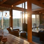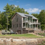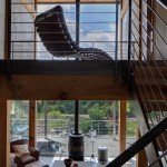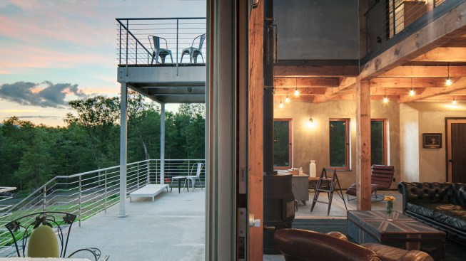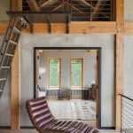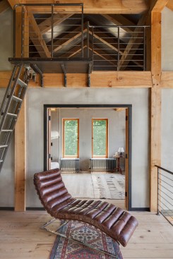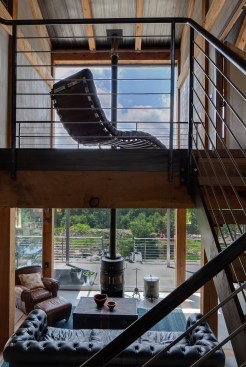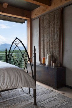 The exterior style reflects the vernacular barn shape and scale of the mid-Hudson region. Hybrid construction of exposed post and beam allows an open floor plan. The dramatic floor-to-ceiling glass front façade provides jaw dropping views of the Catskill Mountains from every room in the house. These high tech glass walls with sliding panels provide passive solar heating, a seamless connection to the landscape, natural light, and fresh mountain breezes in summer. The well-insulated walls and ceiling along with an energy efficient ground source heat pump system with radiant floor heat provides comfort in the winter. A woodstove helps take the chill off on spring and fall mornings. A ground mounted PV solar system will someday make this residence net zero energy.