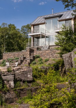 The site for this weekend retreat house is a decommissioned bluestone quarry near Woodstock, New York. The quarry, with views reminiscent of 19th Century Hudson River School of Art painting, provided a dramatic and unique design opportunity.