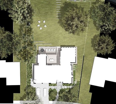 The house is heated and cooled with a geothermal system that benefits from the adjacent lake. The flat roof was designed to accommodate a future solar photovoltaic array and solar hot water array, with available conduits linking directly through the house to the basement mechanical room.