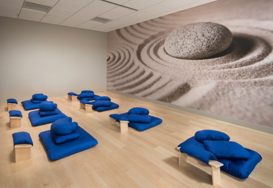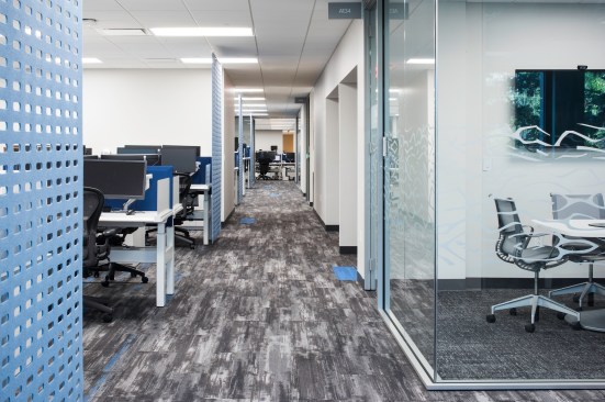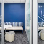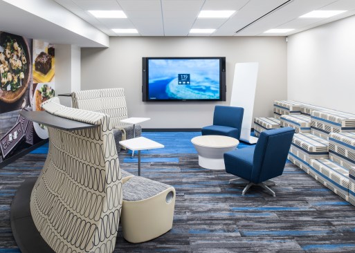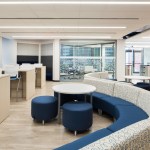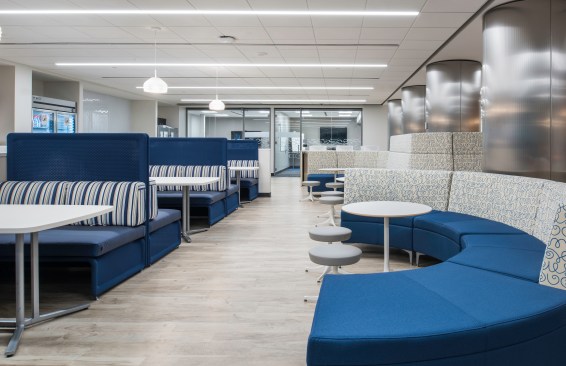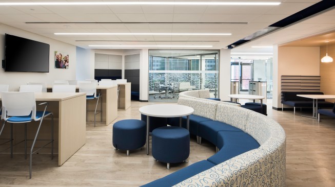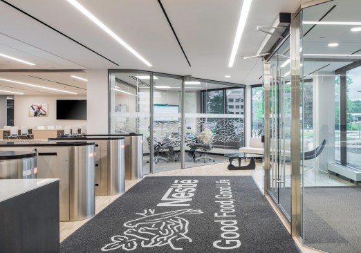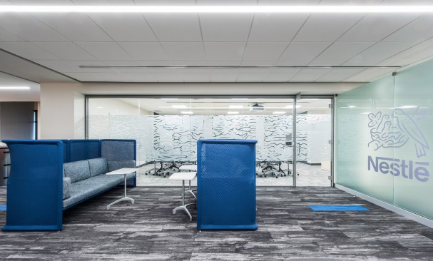 Employees in Nestlé USA’s newly renovated Harper Building prioritize where they work based on the tasks at hand, delivering on a key project driver to develop an environment where spaces are attributed to activities rather than individuals. Whereas the Harper Building was formerly more segmented, with offices, test kitchens, and conference spaces, the renovation reduces the number of closed spaces, and entirely eliminates the private office to better align with today’s employee preferences. The Solon, Ohio-office building is the first adaptation of Nestlé’s new global design standards in the North American market. Nestlé worked with DLR Group | Westlake Reed Leskosky to introduce a continuum of task-oriented spaces ranging from quiet rooms for deep focus; open office spaces for daily tasks and routine work; and shared social hubs and conference rooms for formal or informal collaboration. The plan is organized with attention to adjacencies for integration, so every employee can easily access any environment regardless of where they are working any given day. Floor-to-ceiling glass wraps privately enclosed spaces to consistently maintain transparency.