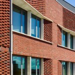 The building’s façade, which consists of brick and limestone punctuated by vertical glass towers, is designed to seamlessly integrate into Penn’s rich architectural legacy. A staggered brick pattern at the windows reflects the building’s internal organization as a home, not an institution, and gives residents a sense of where they live in the scope of the block-long College House. Windows are collected into double height groupings of four, each assembled into a ‘neighborhood face,’ and allow for a rich and dynamic display of light and shadow within. In deliberate contrast, the glass towers containing neighborhood common areas punctuate the brick residential bays and expresses social purpose of the building.