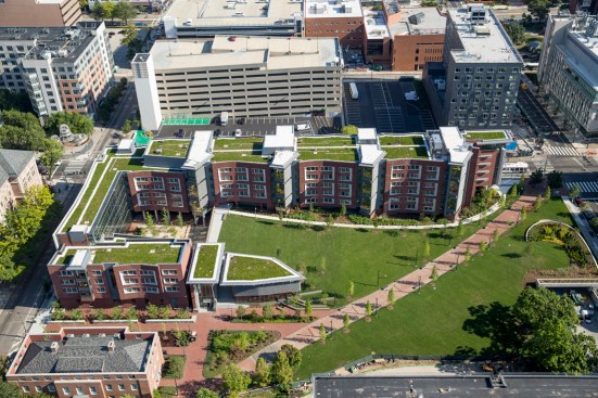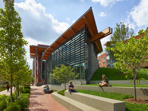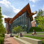 The new building conserves energy through high-efficiency lighting and abundant access to natural light, while its green roofs, lawns, and gardens help retain 95 percent of storm water. Inside, building materials were chosen for their sustainable qualities, including 120 dining chairs locally fabricated in Pennsylvania and made from 20,000 recycled soda bottles. During construction, a waste-recycling plan diverted nearly all construction and demolition waste from landfills.