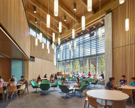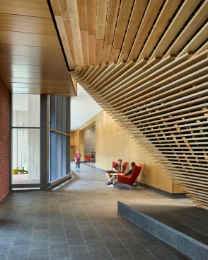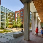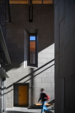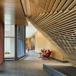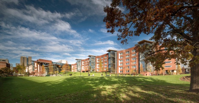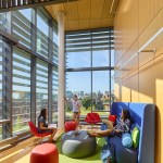 An array of interconnected spaces with distinct spatial qualities and characteristics foster diverse learning and social engagement inside the seven-story building, while circulation and lounge areas draw views of Penn’s surrounding campus community and Center City Philadelphia. Suite-style residences accommodate 350 students, along with living spaces for faculty, graduate students, deans, and advisors. The suites are collected around sunny day-lit common room towers, which act like beacons of community in the landscape.