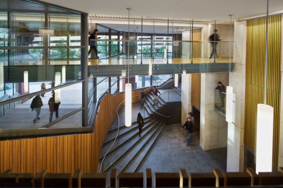 The garden courtyard is encircled on three sides by lively social spaces. The fourth side is home to the dining café and pavilion; its green roof acts as the crown of the sloping lawn and marks a public passageway that slices through the building, offering glimpses into the private courtyard below.