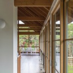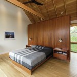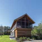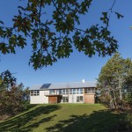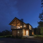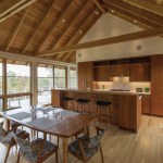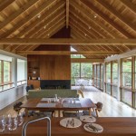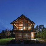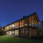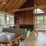 A long, rectangular building under a gabled roof, the two-story home, which was built by AF Hultin & Co., welcomes those vistas and breezes, particularly through the large screened porch on the east end of the building, which can be opened to the rest of the second floor via a wall of large sliding glass doors. The remainder of the level is wrapped almost completely in windows, and the exposed wood structure inside further blurs the distinction between the home and its woodland environment.