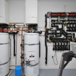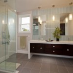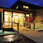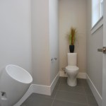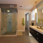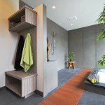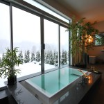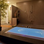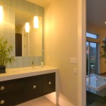 Inspired by the traditional “Onsen” Japanese hot springs bath resorts, this design fuses the long-established Japanese bath concept with contemporary design. First you cleanse your body in the shower area (made of a light-weight water-proof material reminiscent of concrete), then you enter the heated tub and open the automatic shade and sliding doors. A customized grey-water diverter valve allows the user to drain the tub water into an outdoor water feature for use in landscape irrigation. A built-in changing area is located at one end of the room and on the opposing wall, a “hidden” door is located for the homeowners to access the onsen from their master bathroom. The completely water-proof tiled floor features a curved path-way running through the room like an ancient bridge over the hydronic radiant heat system. The master bathroom features a Western style set-up for daily use including a steam shower and a floor to ceiling blue stream embossed glass tile design.