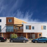 This multi-family residence consists of three townhouses – a two-story three-bedroom unit and two three-story two-bedroom units. Through thoughtful use of scale, form, and material, the modern design offers a contextual connection to the surrounding neighborhood that hosts architectural styles ranging from Mediterranean to French and Spanish Revival. White washed stucco offers a familiar color and texture while the wood siding and steel accents introduce warmth and visual interest. Overhangs, trellises, and a feature window box provide shading in conjunction with reflective roofing to mitigate heat gain. The mansard roof echoes the adjacent French Revival but steps down towards the street corner to respond to the scale of the surrounding homes. The curved west façade accentuates the triangular site, reminiscent of the local winding streets. Private decks are carved from the upper story to provide outdoor space while compositionally interrupting the length of the façade.