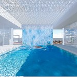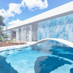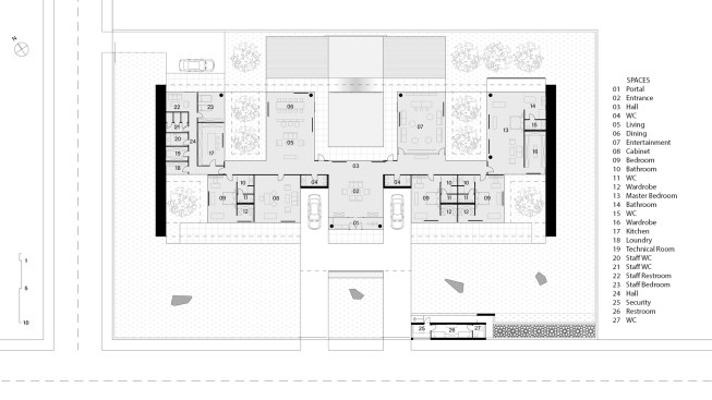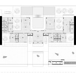 The miniature waterfalls drop at the entrance door and in the backyard pool. Small gardens symmetrically break up the space adding organic atmosphere to the house.