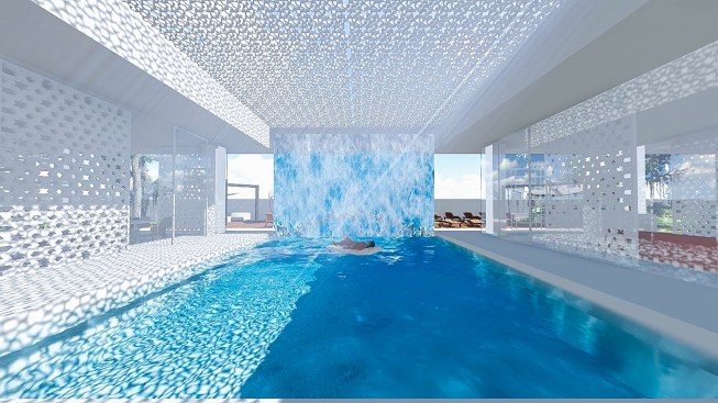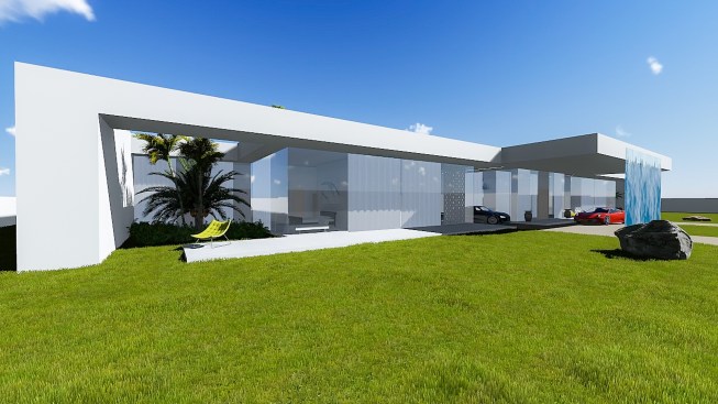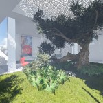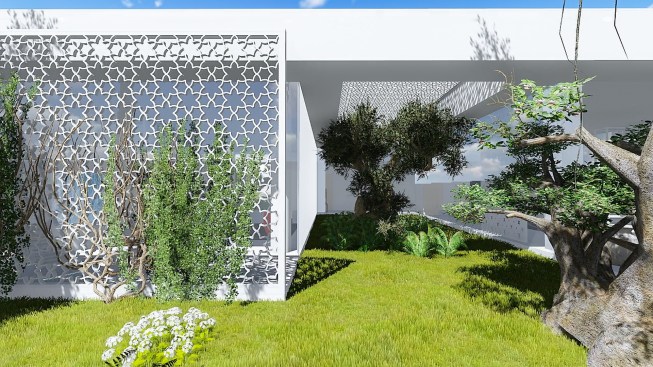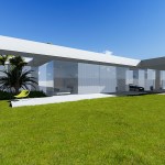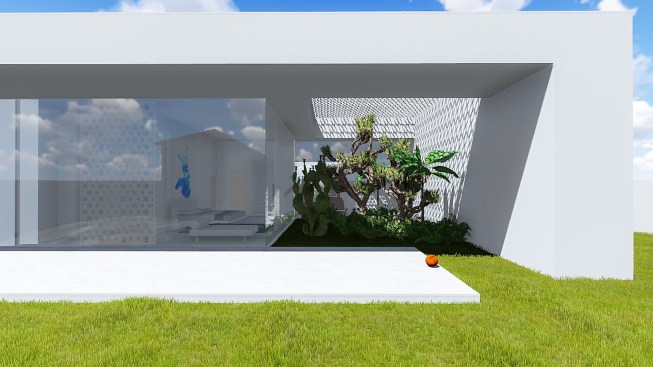 The glass house is condensed with multiple rooms of various functionalities and in order to balance the busyness, it is executed with minimalist approach. Transparent walls convey a sense of unity of internal areas, as well as wholeness with the external space and amplify the contrast between hot climate and the cool interior. For achieving a privacy in a single room, it may be skirted with remotely controlled white panels, spread with simplified oriental ornaments. Shadows cast by these traditional outlines augment the particular character of the house.