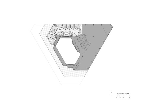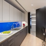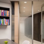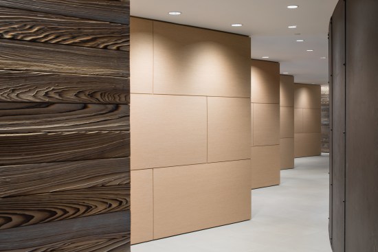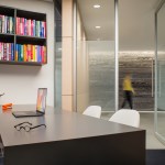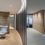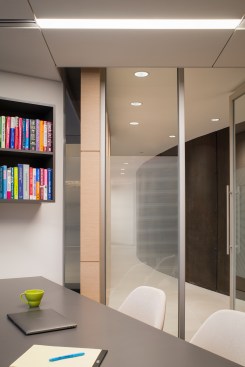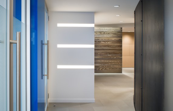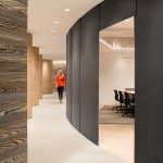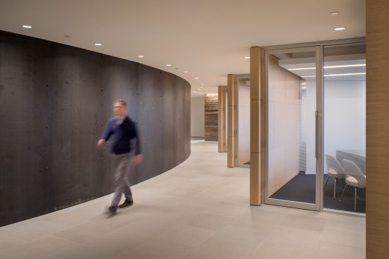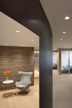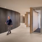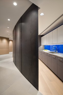 Located on the 12th floor of a 16 story, triangular shaped office building in Bethesda, Maryland, this space provides new offices for a small, prominent investment firm. The existing building is organized around a twelve story atrium. When combined with the building’s triangular shaped footprint, many of the tenant spaces result in unconventional geometries. Often, today’s office “parti” consists of oversized, glamorous entry areas and large, underutilized conference rooms that frequently have the best light, the most windows and prominent views. In the design of these offices, the prime floor area is given to analysts and staff who spend long hours in the space and not to the infrequent visitor. Unlike, the communal workspace that is open, noisy and impersonal, the analysts at this firm are given small private offices with the goal of optimizing focus and productivity. In response to the shape of the tenant floor plate, the space is organized around an eighty five foot long, curving hot-rolled steel plate wall that separates the public areas from the private offices. This 1/2” thick steel wall provides a threshold between these private and public realms. Public areas are located near the building core and the atrium space. Slots of glass in the conference room and a glass entry wall provide views toward the atrium and allow natural light to permeate these spaces. The curving steel wall combines with “blades” of white oak paneling to create a dynamic circulation space that is initiated at the reception area and incorporates access to every office and the service spaces. These “blades” are arranged to optimize natural light into the circulation space, while providing both privacy and views from the office workspaces. Depending on orientation, the wood “blades” present themselves to be almost completely solid or almost invisible. The multiple geometries and the materials selected combine to create an environment that is simultaneously dynamic and serene. Charred wood walls, wide plank white oak flooring and Pietra Serena sandstone flooring define spaces and render the space calm, with quiet, natural qualities. The curving steel element and vibrant blue glass walls in carefully orchestrated locations animate the composition and provide an unexpected juxtaposition. Secondary spaces are designed with the same high quality materials and attention to detail as the primary spaces. The kitchen shares the curving, hot rolled steel wall panels while incorporating rift wood base cabinets, white glass wall cabinets, stainless steel countertops and a blue glass wall element. The lounge area includes white oak, wide plank flooring and the same vibrant blue glass wall panels. A diverse palette of materials and the non-orthogonal geometry of this office space are intended to provide an environment unlike a proto-typical office plan. Ideally the goal is to change perspectives, physically and psychologically of both the visitor and the daily user to create an environment that is pleasant, inspiring and productive.