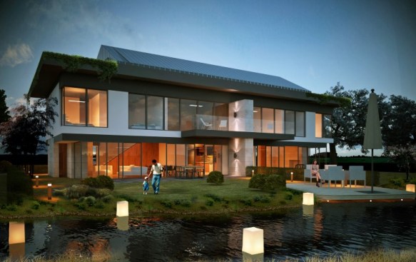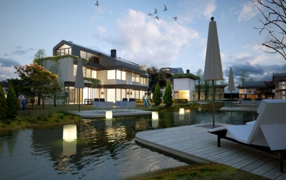 Iglo Architects planned a spacious promenade at the riverside and also took the water element into the landand placed the houses around the water so that all locations propose a similar experience.
