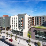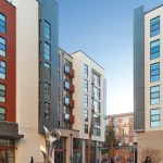 The new mixed-use development at One Henry Adams Street occupies a full city block in the heart of the historic Showplace Square neighborhood, just south of Townsend Circle. The plan features two, independent buildings separated by a publicly-accessible pedestrian mid-block mews connecting Henry Adams and Rhode Island Streets across the 1.65-acre site. The smaller North Building has 5 floors of apartments over ground floor retail space. The South Building has a larger footprint to accommodate the development’s above-grade parking garage, which is encircled by neighborhood-serving commercial uses. Together the buildings comprise 239 apartments, 157 parking spaces (most in mechanical shufflers), residential amenity areas, and 13,140 gsf of ground-floor commercial space.