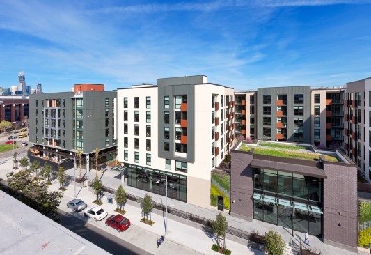 Unlike many of its urban counterparts, this high-density complex has no internal courtyards. The H-shaped South Building turns its podium garden spaces outward, creating the impression of multiple, smaller buildings lining Henry Adams and Rhode Island Streets. The project responds to San Francisco’s Eastern Neighborhood’s Plan which encourages a transition of the neighborhood from its industrial past to a more mixed use, neighborhood-serving character. The building design and choice of materials create a unique dialogue with the adjacent brick warehouses. Clean lines, classic proportions and the juxtaposition of metal, plaster and timber speak to the mingling of old and new urban forms that characterize the essence of the Showplace Square Neighborhood.