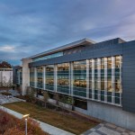 The steel superstructure supports a layered envelope of insulated metal panels, pre-cast concrete panels, and energy-efficient glass shaded by strategically configured perforated stainless steel solar screens. The building orientation takes advantage of diffuse light and views onto the plaza on the north, while striated insulated metal panel walls shelter the western exposure. Strategic angled vertical mesh panels to the east and south reduce glare and provide shading while maintaining transparency.