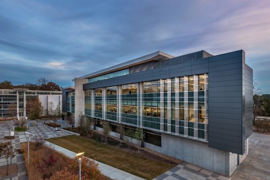 One Research Drive, a four-story research and academic building on Clemson University’s CU-ICAR campus, features flexible research and office space for innovators and entrepreneurs supporting the region’s automotive cluster. Located on a prominent entry into Technology Neighborhood 1, the building expresses the campus’ technology focus with sleek metal, glass and concrete facades. The transparency of the design visually connects the advanced technologies inside the building with the connecting pedestrian plaza.