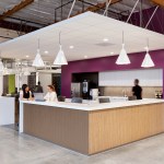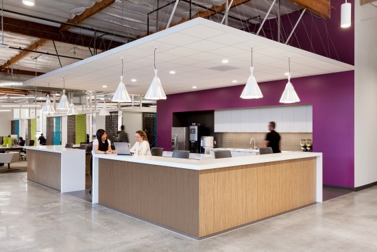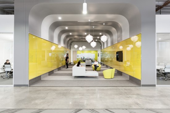 Additionally, HGA compiled employee feedback to discover a third challenge: design a space that connects staff from engineering to the marketing and administrative departments with amenities for a “work-play” atmosphere. The result was a 25-foot collaboration tunnel inspired by a camera’s zoom lens to serve as the cornerstone of the design that connects the entire office. Also included was a large, all-hands area for employees to break for lunch, as well as an espresso café and a library–all easily accessible via a scooter or skateboard along stretches of concrete hallways.