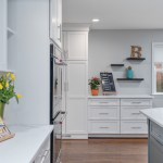 The transitional kitchen is now the heart of the home. The oversized, Seaside Blue island is the true focal point of the room. Schrock white shaker custom cabinets surround the perimeter with a quartz Calacatta Venice countertop throughout. The glass and marble mosaic backsplash ties everything together. The reach-in pantry and drop zone provide extra storage for the family.