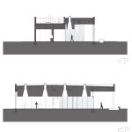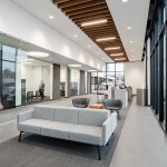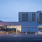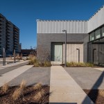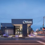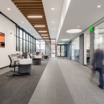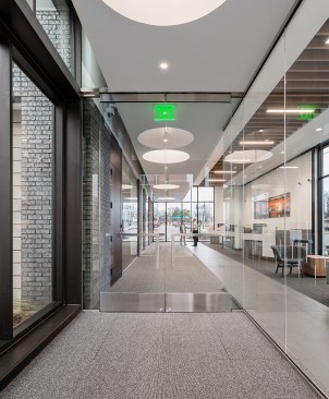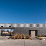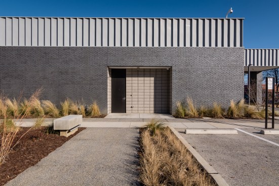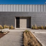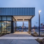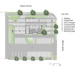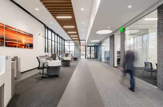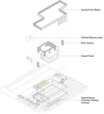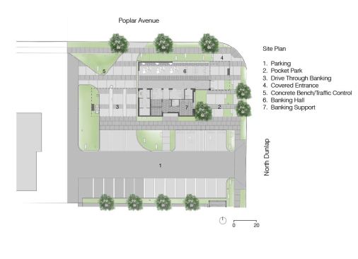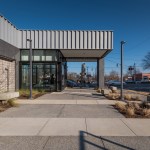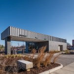 The design strategy uses bands of material that stretches across the site, creating spaces for pedestrians and vehicles and weaving surrounding context to exterior and interior spaces. The building massing is comprised of two interior volumes linked to two covered exterior spaces. The volumes, one glazed open banking hall, and one more closed support structure slide past each other along the site’s bands. The open glazed volume is positioned closer to the corner, addressing the corner and welcoming pedestrians. The closed volume slides away from the street, creating a pocket park between the parking area and the covered building entry. The closed volume’s canopy creates a space for drive-through banking. An undulating zinc panel system traces the outlines of the interior and exterior building volumes and touches down once at the corner of the open banking hall. Brick forms support the curtain and create a variety of interaction spaces from inside to out.
