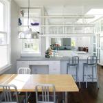 A U-shaped layout of painted wood base cabinets and a small working island, both with stone-composite counters, define the cooking area and contrast with the darker wood floor, an engineered material surfaced with reclaimed oak. Ceiling-suspended storage—glass-front cabinets toward the dining room, open shelves toward the breakfast area—brackets the space at eye level. “It’s a kitchen that has a ton of counters and a ton of storage but doesn’t feel very substantial,” Feldman says, “because everything’s put away.”