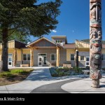 The new building, built on the footprint of the old, returns the entry to Lincoln St. side. With the scale and feel of a schoolhouse, the building form and facades were developed to relate to the neighboring American and Russian colonial architecture. The site design however is more connected with local Tlingit culture. An ovoid concrete pattern and cedar benches form a plaza around the existing totem pole. Native plant gardens connect the school to the local ecology and horticulture.