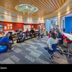 To support an “expeditionary learning” model, the school was designed to be connected inside and out. A central elliptical gathering space provides a shared living room that connects to the front office. At the end of each term, student presentations can be given in a “super classroom”, formed by opening two classrooms and an adjoining flex room.