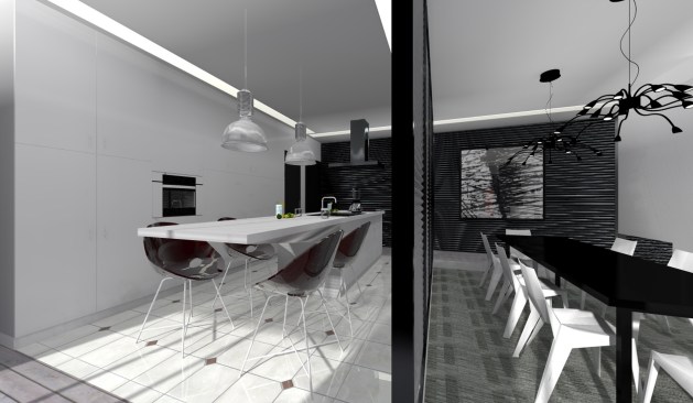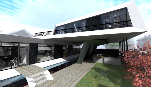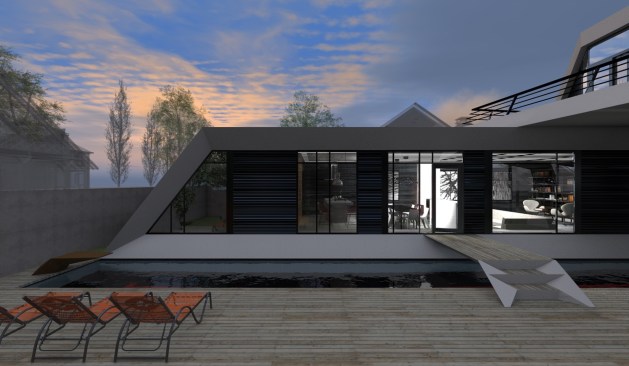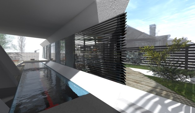 The white stripe at the entrance door tracks the silhouette of the building toward the backside, where it expands and folds into angular shapes, creating the unified coating for the entire space. The territory is bounded with the structure, made of concrete metal panels and horizontally arranged metal rigs, intriguing an outsider, while keeping obscurity. The long first floor space is broken up into the living room, the kitchen and the bathroom. All these areas connect to the open hallway without doors, dismantling a sense of divisions. The small bridge, with the long open pool underneath, links the dining room to the yard. The open parking spot is also integrated in the yard.