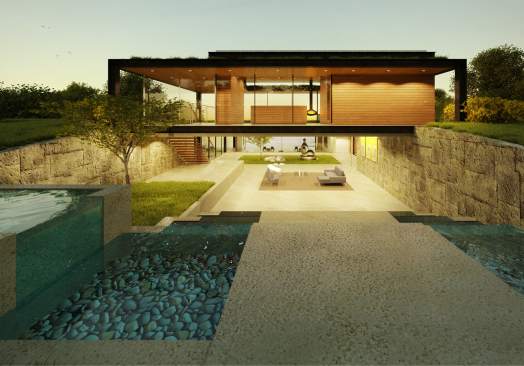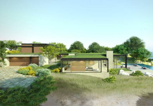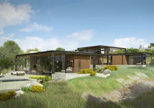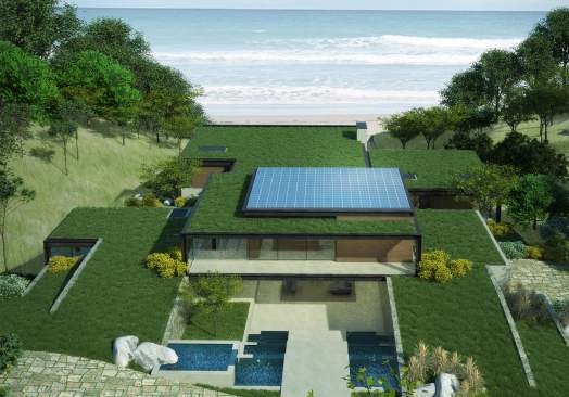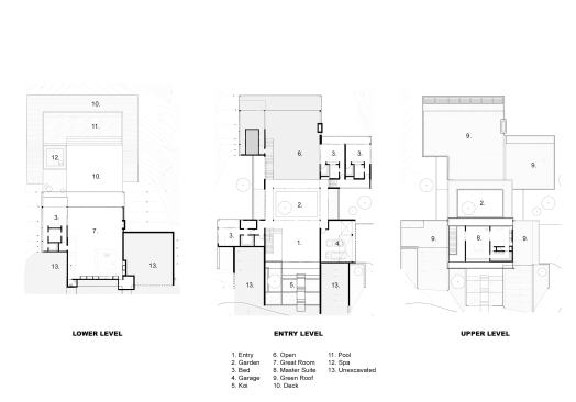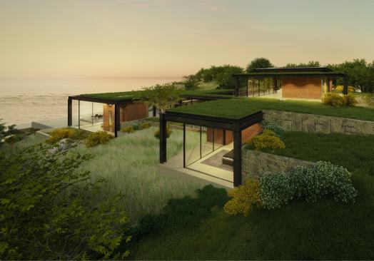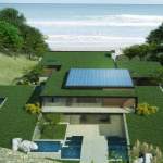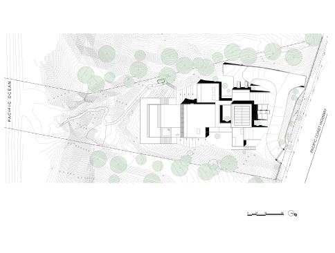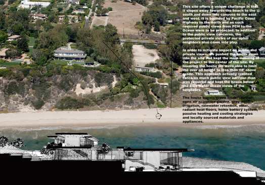 This site offers a unique challenge in that it slopes away towards the beach to the south and down into canyons to the east and west. It is bounded by Pacific Coast Highway to the north and as such required public views from PCH to the Ocean were to be protected. In addition to the public view concerns, the protected private views of our uphill neighbors also came into play. In order to mitigate impact on public and private views, we pushed the house down into the site and kept the main massing of the project to the center of the site. By lowering the house we were able to limit the over all height to less than 18’ above grade. This approach actually created twice as much public view corridor than was required and kept the house below the blue water ocean views of the neighbors. The house boasts green roofs, interior open air sculpture garden, grey water irrigation, rainwater retention, solar, radiant heat floors, home battery system, passive heating and cooling strategies and locally sourced materials and appliances.
