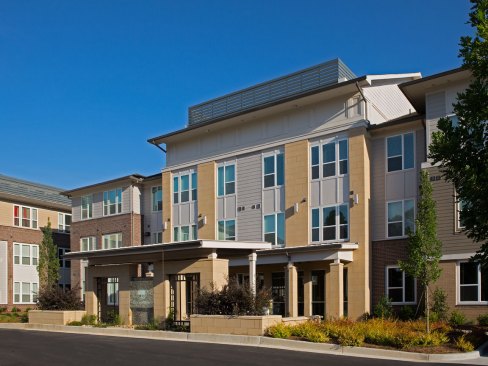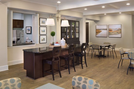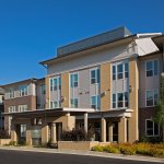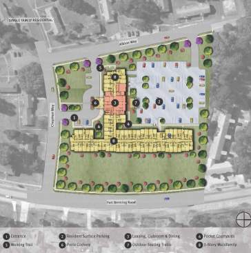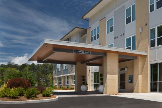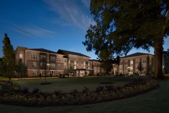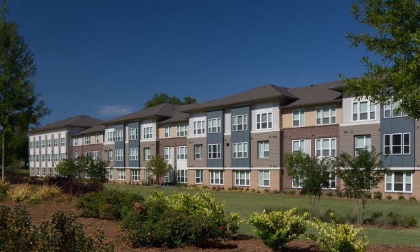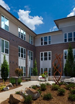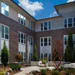 Patriot Pointe in Columbus, Georgia is a 100 unit, Senior Housing development. The site was previously run down public housing before development of the new project. The site lies in between two major streets in Columbus, Fort Benning Road and Chapman Way. The building is a 3-story, double loaded corridor layout with a sequence of spaces linking the front to back. There are small seating areas throughout the corridor and elevator lobbies to facilitate informal social interaction. The main clubroom on the first floor serves as a community space to encourage residents and staff to socialize and create a space for daily interaction. The senior residence units are 100% accessible. Five of the units are equipped for mobility disabled residents including roll-in showers and two of the units are building for learning and site impaired residents. All units feature large walk-in closets and space for full washer/dryers. Every unit at the front door features a shelf for seniors to display personal memorabilia and therefore becomes a memory clue as to the location of their units on a long corridor of identical doors. The exterior of the building has a transitional/contemporary style with a subdued color scheme incorporating over 40% brick and limestone accented with warm detail. The entire community is designed to meet Earthcraft Multifamily and Neighborhood standards, which includes energy star appliances as well as a quarter mile walking trail around the property.