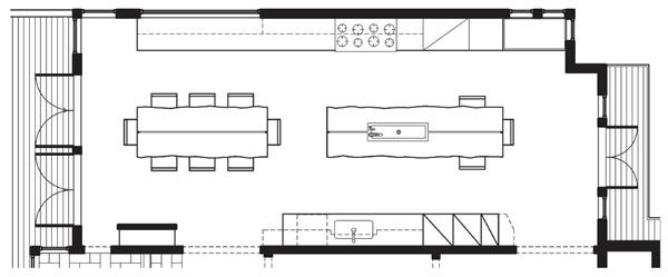Fabricating the open island was especially tricky. Plumbing, wiring, and disposal installations had to be exact, Finne says, so everything would be in the right spot when the island was put in place. To make those exposed guts look good, the architect speced blackened copper piping and a stainless steel disposal shroud. He also concealed the electrical outlets beneath the island tabletop, because there are no vertical surfaces. It “was a huge challenge,” he acknowledges, “because the mechanics of an island are usually hidden, and in this case nothing was hidden.”