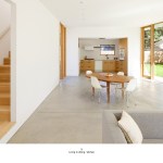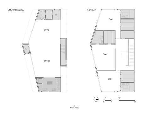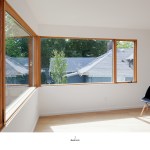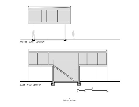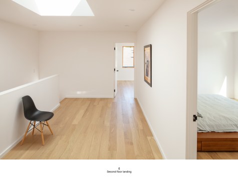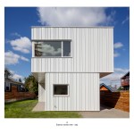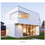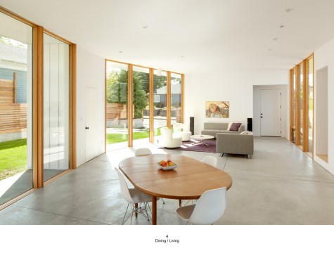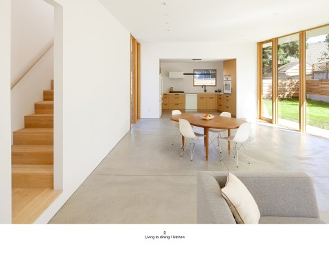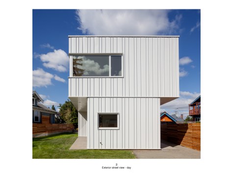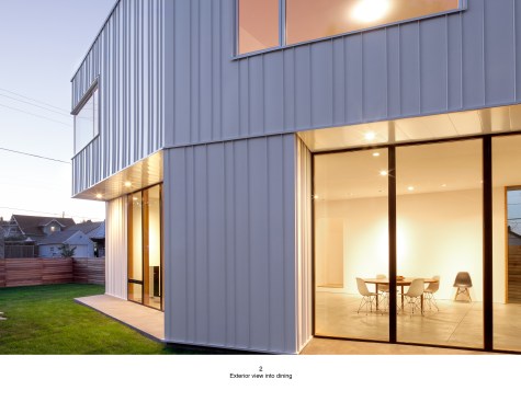 PAVILION HOUSE The clients wanted a glass house. The difficulty was that they wanted this house placed on a visually exposed 50’ x 100’ city lot that they owned in NE Portland. This posed the challenge of designing a glass house with privacy. Our solution was to design a pavilion-like structure in which the body of the house is supported by 4 ten-foot tall β€œlegs.” The legs are placed strategically to block unwanted views and provide privacy. These 4 rectangular legs (housing stairs, kitchen, bathroom and storage) support the second story. Between these legs, the open floor plan expands to outdoor living through floor to ceiling glass and doors. The polished concrete floor is cast on grade, creating a seamless transition to the surrounding yard. Stepping into the north leg the mood changes as the stairway leads up to the bedroom level. Upstairs the spaces and rooms are more cellular and intimate. This part of the house is designed for flexible living arrangements (family or house sharing) with 3 compact, self-contained bedroom suites that wrap around a central landing and common study space. The exterior is clad in standing seam white metal panels of varying width. The panels wrap the pavilion legs giving the impression that the house has been reductively sculpted from a single mass.