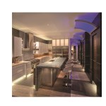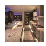 Tall refrigeration units with aluminum framed translucent illuminated panels anchor the “L.” High gloss acrylic cabinets and a glass curtain wall corner expand the space connecting to the Roof Terrace beyond.
