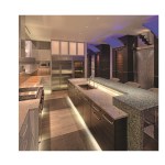 The zebrawood cabinets and the recycled glass counter at the island provide a social center. Separation of vertical and horizontal planes is maintained with contrasting material selections and concealed linear LED lighting. Horizontal datum lines of window mullions, cabinetry, and aluminum accent banding align to unify the elements.