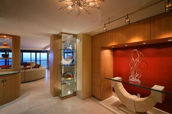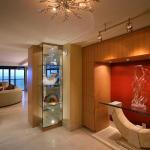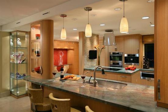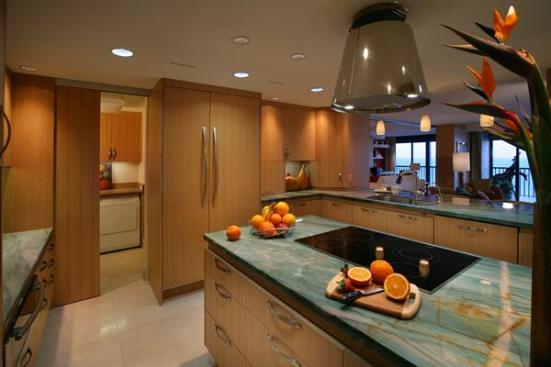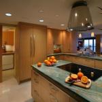 This 1,621-square-foot condo started out as a vacation home. When the owners decided to downsize and make it their permanent residence, they turned to K2 Design Group and Frey & Son Remodeling to give its dated kitchen a facelift. Step one involved removing walls to open up the cramped space to the living room. This freed up space for a peninsula with water views, a cooktop island, and extra cabinetry. Custom glass and wood cabinets conceal plumbing and electrical panels while creating display niches for the owners’ glass collection. And the fresh palette—White Oak cabinets, stainless appliances, and Cancun Green Granite countertops—evoke the colors of water and sand.