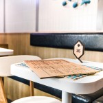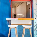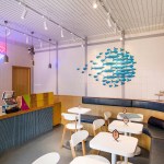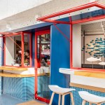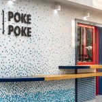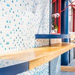 The client’s brief challenged the designers to create a modern eatery that reflects the Ha-waiian origins of its food within the constraints of the small space. STUDIO DOHO created outdoor bar counters that transition into the ordering area, while linking the interior and exterior space. The counter-tops with a colorful surfboard tip to integrate them into the façade. The storefront was designed with a gradient tile mosaic that transitions from ocean blue to white, adding color to the streetscape.
