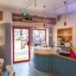 Extensive demolition work was required on the interior, including adding steel structure to allow the existing walls to be removed and create sufficient space for the kitchen and din-ing area. The colorful material palette was kept simple on the cozy interior, creating a re-laxing café atmosphere.