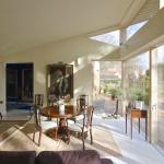 The building is predominately orientated towards the south to take advantage of the sun-path. The accommodation is organised into two distinct and separate volumes, namely living rooms and bedrooms. The two volumes are separated by a glass entrance lobby, which aligns with the pond and the mature garden beyond. The mono- pitched roof of the main living room benefits from a double height volume, with a large area of glazed windows contributing to controlled solar gain which allows warm air to rise naturally to the highest point of the roof.