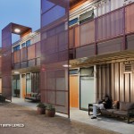 Three standard 20-foot long steel containers are assembled to form the open-plan units. Each 450-square-foot apartment is configured with a bedroom plus dining area, kitchen, and bathroom. The aesthetic is enhanced through the strategic placement of what the designers dub “exterior elements” that camouflage the structure’s rather pedestrian origins. These include a wood wall at the front façade that protects the main stair to the second floor and a series of metal screens support the second-floor corridor and provide vertical elements within the courtyard.