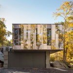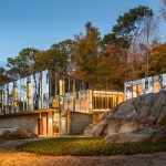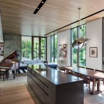 As a result, the house gains solar heat and retains it very efficiently during the winter. During the warmer months, apertures oriented for cross-ventilation greatly reduce the need for mechanical cooling. The judges raved about the home’s striking exterior, which is composed of a variety of materials including zinc-coated copper, brushed stainless steel, polished stainless steel, and glass, each chosen for the way they create a reflection of the rugged landscape.