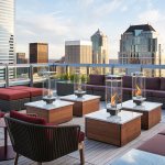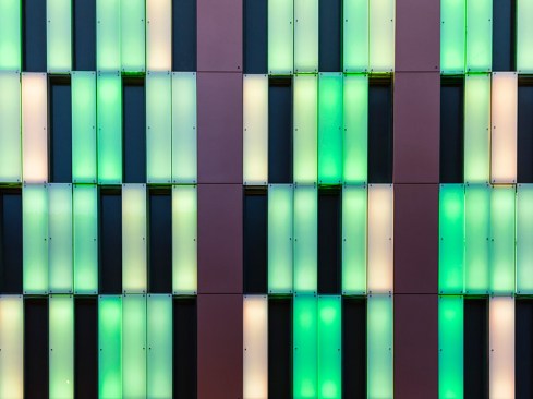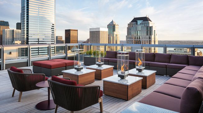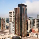 The project is marked by a bold design with a playful curtainwall façade composed of high-performance glass broken by a staccato rhythm of metal columns with a fragmented, stepping verticality that reaches for the sky. Rich, earthy rust, gray and bronze tones complement the vintage masonry of the adjacent 1929 Paramount Theatre.