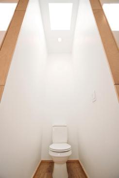 Pardo repeated many of his kitchen design choices here. Long, narrow windows placed high on the exterior walls let in light while maintaining decorum. A trio of skylights also helps bring sunlight into the center of the room. Gray, solid-surface countertops run the length of the vanity, and pale plywood wraps the water closet and the room’s cabinetry. Bamboo flooring stretches unobstructed from bath to master bedroom to convey a sense of one continuous space.