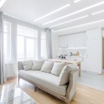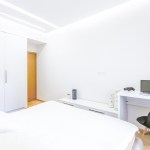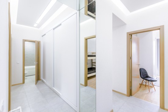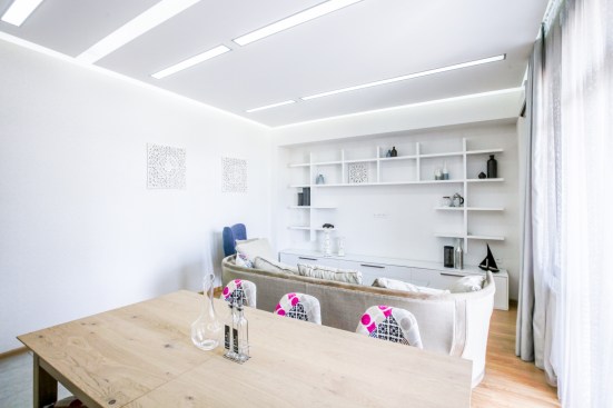 The white walls and the large mirrors make the space appear sizable. The wooden components of the interior bring an unifying ambience into play. The technical lighting illuminates the rooms without distracting the eye.