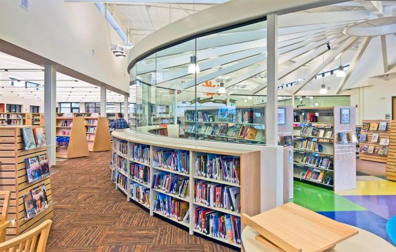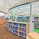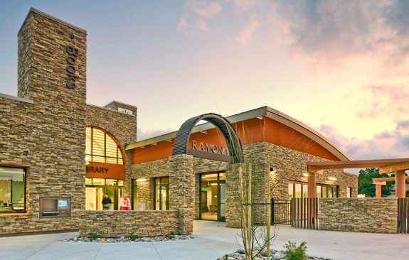 Strong, vertical design elements such as the clock tower, the fireplace chimneys and the book drop tower recall Tuscan hill towns while adding visual emphasis to Ramona’s history. Two prominent, publicly accessible plazas connected to a grand “historical” lobby clad in ochre colored stone and crowned by an oversized arched window form the core of the library and set the stage for a wonderful discovery-filled venue.