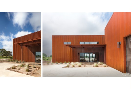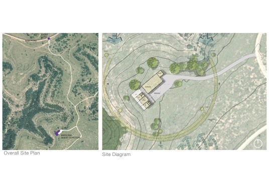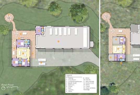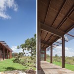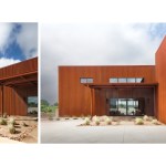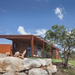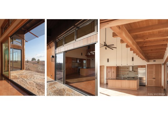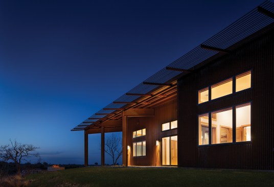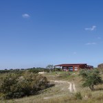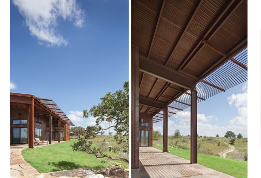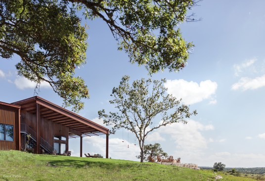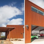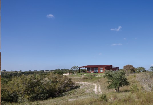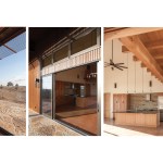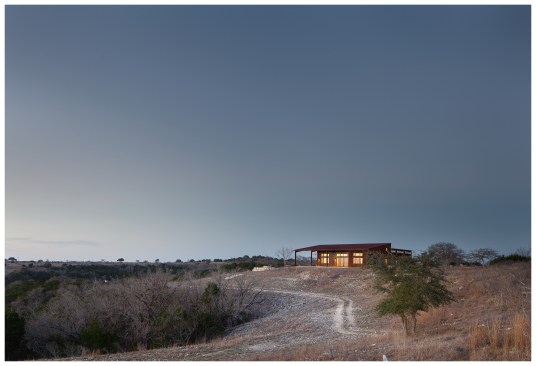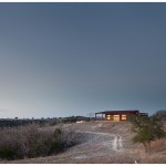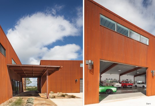 Located on a 700 acre ranch Southwest of Boerne Texas, this new modern “barndominium” was originally planned only to be the barn for the necessary ranch equipment and to store the family motor home. The Program expanded quickly into adding a family living quarters to allow for the Owners and visiting extended family to engage the beautiful Hill Country setting. The site was located to on a bluff overlooking the ranches deep canyons. Since an existing motor home’s size drove the initial program for building height and size, a metal building design was selected. Quickly expanded to allow for the Owners private car collection, the larger barn and new living quarters was separated two building forms to help break down scale. To tie the building to the sites natural vistas, a landscape sympathetic weathered steel siding with a naturally developing patina was selected. After working out the height requirement for the barn, the similar scaled living quarters with a 3 bedroom/2bath first floor with compact open living spaces with additional sleeping spaces on the second floor with an interconnected timber framed bridge on the second floor overlooking the living spaces. Picking up on the panoramic mile long views, the Living quarters engages the southwest sun and site with deep covered porches for year round use.